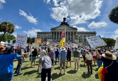 S.M. in Oak Ridge, TN, writes: I joined a group of friends in Knoxville for the Hands Off march. It is difficult to say how many people attended, because we were sent out in small groups to street corners and medians all over downtown. Estimates vary between 2,000-4,000 people—in very red East Tennessee! My group was located in the median of a street with several lanes of stop-and-go traffic. We were extremely encouraged by the drivers' responses! Hundreds of people honked, gave us thumbs up, or yelled in support. One person who kept count said that about one in three cars which drove by us responded positively! On the flip side, we only saw about five drivers who reacted negatively! I can't emphasize enough how amazing this is in East Tennessee—the reddest of the red!
