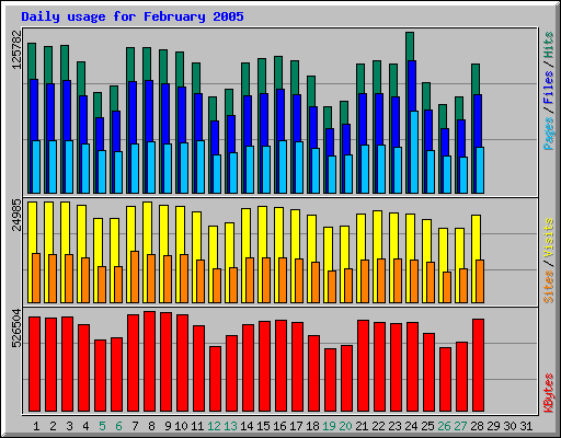 | Day | Hits | Files | Pages | Visits | Sites | KBytes | ||||||
