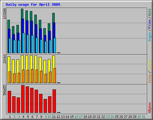 | Day | Hits | Files | Pages | Visits | Sites | KBytes | ||||||