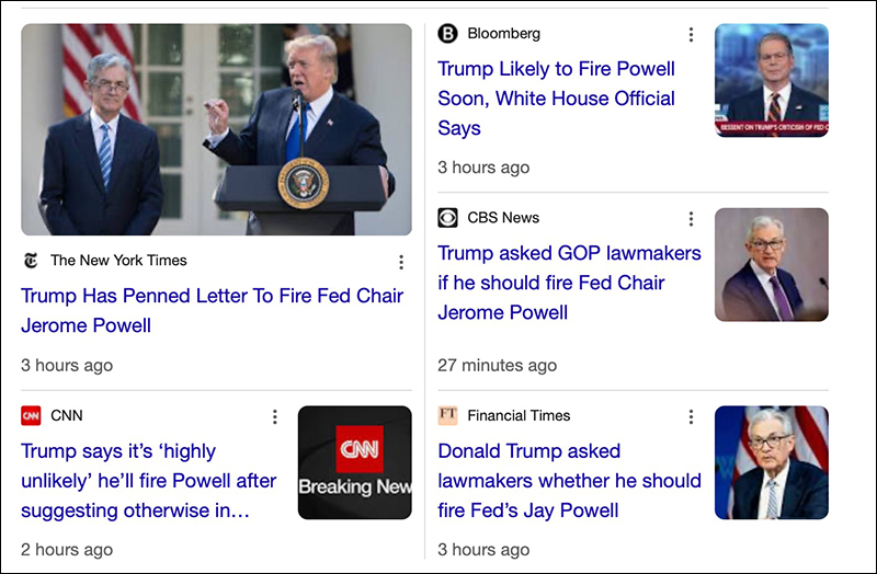 Yeah, it's a weird headline. We agree. So why is this even a news story in the first place? Well, because Donald Trump told members of Congress yesterday that he drafted a letter firing Fed Chairman Jerome Powell, then he told other members that he wouldn't do it. Here is the result of a Google search for "Will Trump fire Powell?" yesterday.